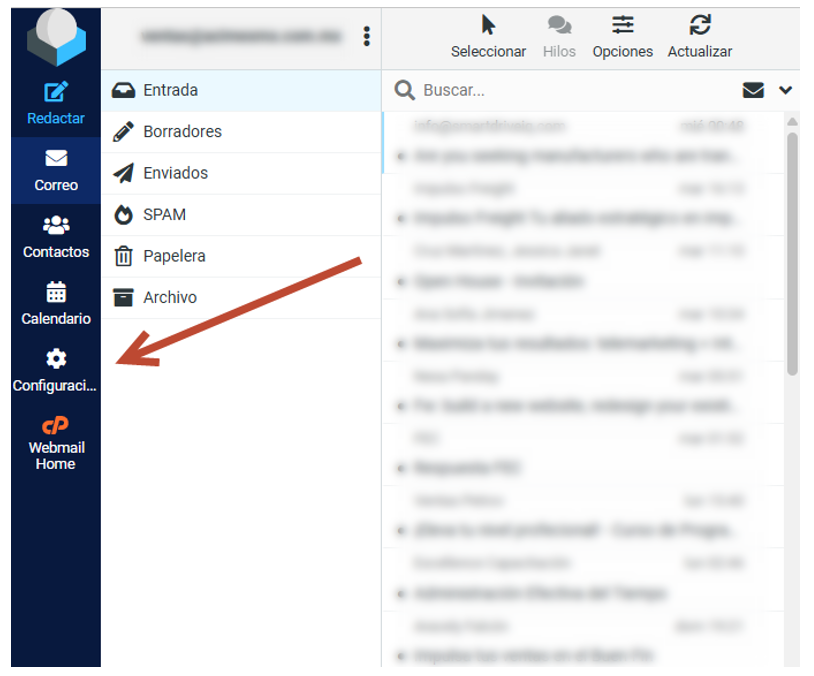 2.- Una vez dentro de Roundcube, pulsaremos en el icono del engranaje, la típica rueda de Configuración.