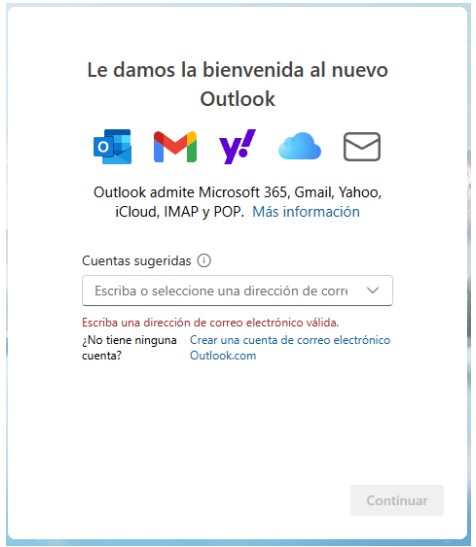 Al abrir Outlook por primera vez, aparecerá automáticamente una ventana que te permitirá ingresar directamente la dirección de correo que deseas configurar.