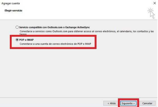 4. Selecciona POP o IMAP y pulsa Siguiente.